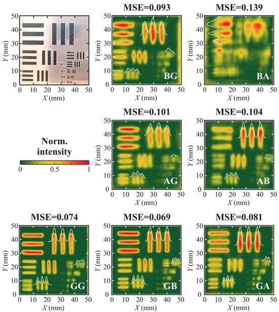 The single-pixel imaging was performed for the seven lens combinations: GG, GA, GB, BG, BA, AG, and AB. Letters correspond to the employed structures marked and , respectively (see Figure 2b). G corresponds to Gaussian beam structure, A—Airy, and B—Bessel. The resulting imaging and the corresponding mean square error (MSE) image comparison values are presented in Figure 4 (the acquired images are compared with the binary image, comprising slits of the same size). A clear variation in performance is observed, depending on the combination of lenses.