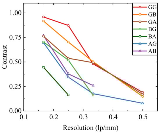 Modular transfer function (MTF) dependency for the above-described single-pixel imaging system, comprising different radiation focusing and collecting element combinations. MTF was acquired by imaging the USAF1951, modified for the THz frequency range. G—Gaussian beam structure, B—Bessel beam, and A—Airy beam.