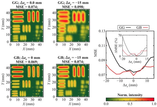 The above-described results were additionally supplemented by the modulation transfer function (MTF) dependencies, revealed in Figure 5. The dependencies were acquired using the above-presented images. One may note that the highest contrast is revealed for the GG and GB configurations. To further analyze the reliability of the investigated systems, the sample-defocusing effect on the imaging quality in the GG and GB configurations was analyzed. The focusing and collecting lenses were fixed and the imaging of the THz frequency range-modified USAF1951 sample was performed with a constant mm shift, acquiring MSE values of the each image. Such a setup is expected to represent one of the possible imaging setup misalignments, wherein the sample to be imaged is placed out of focus of the system. The graph in Figure 6 reveals the MSE dependencies on the sample shift. Firstly, it is worth noticing that the MSE of the GG system is almost always higher, possibly due to the above-discussed reasons. What is considered much more interesting is that the relative change of the MSE (depicted in percent in the inset of Figure 6 for further clarity) is considerably lower for the GB system compared with the GG case. This result supports the above claim that the GB system is less sensitive to the component misalignment.