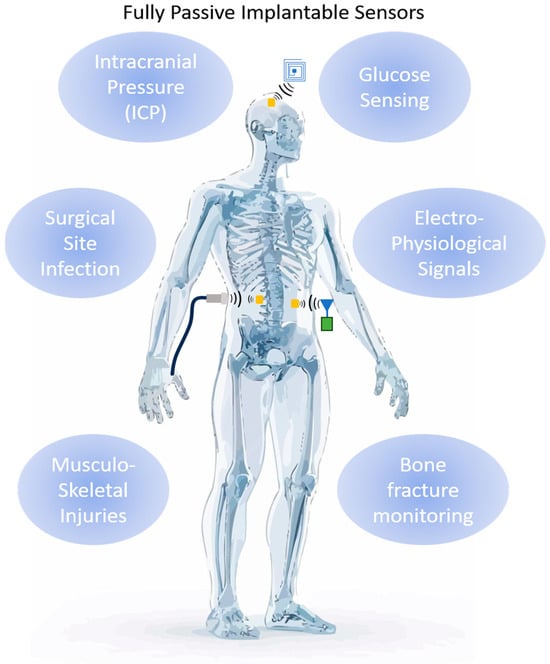 Representative applications of passive implantable sensors. These can be interrogated using ultrasonic (using piezoelectric transducers), inductive (using inductors) or radiative coupling (using antennas). Background human image by @migstc1, from Freepik Company S.L. Malaga, Spain (www.freepik.com, accessed on 22 October 2024).