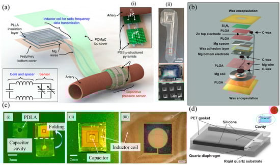 Examples of passive implantable pressure sensors based on the capacitance change caused by a deflection of a membrane. These types of sensors are referred to as MEMS (Micro Electro-Mechanical System)-type in the text. (a) The biodegradable and flexible arterial-pulse pressure sensor of []. Reproduced with permission from Springer Nature. Published in Nature Biomedical Engineering (https://www.nature.com/natbiomedeng/, accessed on 23 December 2024). (i) Close-up illustration of the pressure-sensitive area with the two variable capacitors, before the sensor is wrapped around the artery. (ii) The fabricated device and close-ups of the double capacitor sensing region of the device and the pyramid-shaped microstructured sensing layer. (b) The biodegradable wireless LC pressure sensor of []. Notable is the use of wax and conductive composite wax, among other novelties. © 2020 Wiley-VCH GmbH. Reproduced with permission from John Wiley and Sons. (c) The biodegradable PDLA-based wireless LC pressure sensor of [], formed by folding the device and adding an intermediate insulating spacer that defines the diaphragm. (i) Before assembly. (ii) after assembly and (iii) magnification of the capacitor and inductor of the sensor. Reprinted from Microelectronic Engineering, Vol 206, J. Park, J.-K. Kim, S. A. Park, D.-W. Lee, Biodegradable polymer material based smart stent: Wireless pressure sensor and 3D printed stent, Pages 1–5, Copyright (2019), with permission from Elsevier. (d) The SAW resonator-based pressure sensor of []. © The Authors 2013. Distributed under the terms and conditions of the Creative Commons Attribution (CC BY) license (https://creativecommons.org/licenses/by/4.0/, accessed on 23 December 2024). No changes were made.
