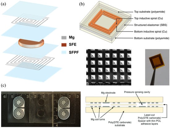 Examples of passive implantable capacitive pressure sensors based on soft, deformable dielectric layers and structured elastomers and diaphragms. (a) The degradable LC pressure sensor of []. It consists of layers of a composite silk fibroin protein film (SFPF) as the sensor substrate and intermediate dielectric and a hydrogel silk fibroin elastomer as the dielectric layer of the capacitor. Mg is used as the conductor. © 2023 The Authors. Distributed under the terms and conditions of the Creative Commons Attribution (CC BY) license (https://creativecommons.org/licenses/by/4.0/, accessed on 23 December 2024). No changes were made. (b) The permanent LC pressure sensor of [] and the pyramidal-structured capacitor dielectric layer of the device. Reproduced with permission from Springer Nature. Published in Nature Communications (https://www.nature.com/ncomms/, accessed on 23 December 2024). (c) The bioresorbable pressure sensor of [] and its cross-section. Mg is used once again as the conductor. © 2019 WILEY-VCH Verlag GmbH & Co. KGaA, Weinheim. Reproduced with permission from John Wiley and Sons.