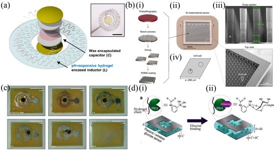 Examples of passive implantable sensors that utilize different material properties for the detection of pH, temperature and glucose through changes in polymer or hydrogel properties. (a) The bioresorbable pH sensor for gastric leakage detection of []. The device consists of a serpentine spiral inductor, which is encased within a pH-responsive hydrogel. The circuit is completed with a wax-encapsulated capacitor. Copyright © 2024 The Authors. Distributed under the terms and conditions of the Creative Commons Attribution (CC BY 4.0) license (https://creativecommons.org/licenses/by/4.0/). No changes were made. (b) An acoustic metamaterial-based temperature sensor []. Temperature variations change the bulk modulus of PDMS and Si, producing a shift in the resonance frequency. (i) The fabrication process of the device. Steps include deep reactive ion etching (DRIE) of a 4-inch, 500 μm-thick Si wafer and coating of polydimethylsiloxane (PDMS) as a polymeric matrix. (ii) The fabricated device. (iii) Scanning electron microscopy (SEM) details of the fabricated silicon micropillars. The micropillars had a nominal height of 350 μm and nominal radius of 35 μm. (iv) The unit cell and its arrangement. © The Authors 2024. Distributed under the terms and conditions of the Creative Commons Attribution (CC BY 4.0) license (https://creativecommons.org/licenses/by/4.0/). No Changes were made. (c) The temperature sensor proposed in [], consisting of an LC circuit with a temperature-sensitive PEG capacitor. The images show the in vitro biodegradation process of the device in PBS at 37 °C. © 2020 WILEY-VCH Verlag GmbH & Co. KGaA, Weinheim. Reproduced with permission from John Wiley and Sons. (d) The passive hydrogel-based glucose sensor demonstrated in []. (i) Illustration of the structure of the device and the broad-side coupled, split-ring resonator interceded by the p(PBA-co-AAm) hydrogel interlayer. (ii) Illustration of the swelling induced to the interlayer in the presence of glucose binding with PBA. Swelling of the interlayer and changes in its thickness, changes the capacitance of the resonator. Upon glucose uptake, the hydrogel swells, increasing the capacitance of the device. Reprinted from Biosensors and Bioelectronics, Vol 151, M. Dautta, M. Alshetaiwi, J. Escobar, P. Tseng, Passive and wireless, implantable glucose sensing with phenylboronic acid hydrogel-interlayer RF resonators, Pages 112004, Copyright (2020), with permission from Elsevier.