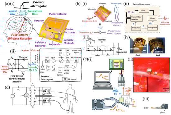 The requirement for battery and wireless power transmission is related to the use of intricate active electronics required to perform complex functions, such as multiplexing, data processing, stimulation, signal recording, digitization, etc. However, particularly for sensing applications, there is the possibility of avoiding the use of active electronics and exploiting the use of passive elements only. Such devices are the focus of this paper.
