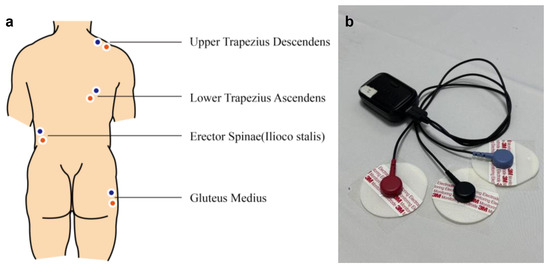 All participants arrived at the lab at 8:30 AM. After providing informed consent and completing anthropometric measurements, sEMG devices were applied. Electrode placement followed The SENIAM Project guidelines [36] and targeted four muscles: the upper trapezius, lower trapezius, erector spinae–iliocostalis, and gluteus medius, representing the shoulder, upper back, lower back, and hip, respectively (see Figure 1a). Disposable bipolar Ag/AgCl sEMG electrodes, each with a diameter of 50 mm, were placed on the prominent areas of the four tested muscles, with the centers of the two electrodes positioned 25 mm apart (see Figure 1b). For the upper trapezius, the electrodes were positioned at the midpoint of the line between the acromion and the C7 spinous process, oriented along this line. For the lower trapezius, the electrodes were positioned at two-thirds of the distance along the line from the trigonum spinae to the T8 spinous process, oriented in the direction of the line connecting T8 and the acromion. For the erector spinae–iliocostalis, the electrodes were placed one finger width medial from the line from the posterior spina iliaca superior to the lowest point of the lower rib, at the level of L2, oriented along the line connecting the posterior spina iliaca superior and the lowest point of the lower rib. For the gluteus medius, the electrodes were positioned at the midpoint (50%) of the line connecting the crista iliaca to the trochanter, oriented along the same line. The skin was carefully cleansed with alcohol to minimize signal interference. Reference electrodes were positioned on non-muscular areas to minimize signal interference.