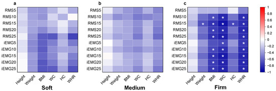 (a–c) Pearson correlation heatmap between participant anthropometric measurements and muscle activation across different mattresses on the lower back. Note: WC: waist circumference; HC: hip circumference; WHR: waist-to-hip ratio (WHR); RMS5, RMS10, RMS15, RMS20, and RMS25 represent the root mean square (RMS) values of muscle activation within successive 5 min intervals (0–5 min, 5–10 min, 10–15 min, 15–20 min, and 20–25 min, respectively). Similarly, iEMG values are calculated over the same intervals to assess muscle activation and frequency characteristics across time. Significant correlations after FDR correction are indicated by * for FDR-adjusted p < 0.05.