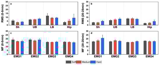 (a,b) Comparison of RMS values across different mattresses during the first and last five minutes. (c,d) Comparison of MF values across different mattresses during the first and last five minutes. Note: Sh: Shoulder (Upper Trapezius Descendens); UB: Upper Back (Lower Trapezius Descendens); LB: Lower Back (Erector Spinae, Iliocostalis); Hip: Hip (Gluteus Medius). All data are presented as mean ± SEM, n = 11.