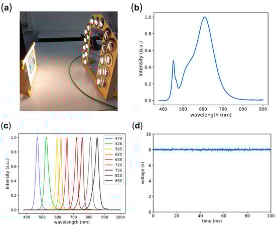 The actively modulated illumination is provided by 36 high-power SMD-LEDs, as shown in Figure 1a. Four identical LEDs contribute to each spectral band, resulting in nine different bands spanning the visible (VIS) to NIR spectral range, as displayed in Figure 2b. The LEDs are powered by a 250 MHz driver (iC-HG30 EVAL HG1D, iC-Haus GmbH, Bodenheim, Germany). The intensities of the LEDs are controlled via potentiometers situated on the driver. The synchronization of the active illumination is achieved by connecting the driver to a microcontroller board (Uno R3, Kuman, Shenzhen, China), which in turn receives the synchronization signals from both cameras. The background light (see Figure 2a), which mimics a surgical light source, is provided by 21 LED spotlights driven by a laboratory power supply. The spectral composition of the background light is shown in Figure 2b. The intensity can be adjusted by varying the current at the power supply to meet the desired illumination, as measured with a luxmeter (PeakTech 5165, PeakTech Prüf- und Messtechnik GmbH, Ahrensburg, Germany). The background light (Figure 2d) is flicker-free, as verified using a photoreceiver (2031 Large Area Photoreceiver, Newport Corporation, Irvine, CA, USA). Modern LED-based surgical lights are often designed to provide consistent, flicker-free illumination. Therefore, we assume that our light source is comparable to surgical lighting systems.