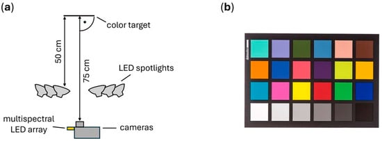 (a) Schematic depiction of the experimental setup. The distance of the cameras to the imaged object was fixed at 75 cm throughout this work; the distance from the LED spotlights to the target was set to be 50 cm; (b) color target. The white patch at the bottom left was used as the test object.