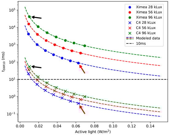 The irradiance of both the active illumination and background light on the camera sensors was measured accordingly. The required time to record the actively illuminated test object with a target SNR of 10 depends on the SNR of a single frame pair. All measured values of the Ximea are above 80 ms, while the required time for the C4 was mostly measured to be below 10 ms. The modeled data show that the Ximea does not reach values below 10 ms for a target SNR of 10.