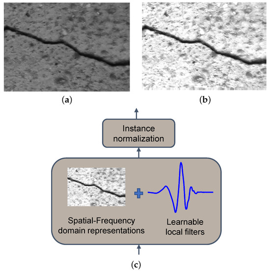 Wavelet transform is a fundamental mathematical tool for multi-resolution analysis. Compared to the Fourier transform, which struggles with non-stationary signals, the wavelet transform effectively extracts both global and local features by the multiscale basis functions [22,23]. The wavelet transform has been widely applied in various fields, such as signal processing, oil exploration, and material analysis [24,25,26]. And the wavelet transform has also been applied in computer vision tasks for decades [27,28]. With the development of artificial intelligence, wavelet transform is introduced into deep learning to strengthen the representation ability of neural networks. In contrast, the corresponding weights are learned in a data-driven way. Wavelet transform was employed to fuse the RGB and thermal infrared images from a frequency perspective, to reduce the impact of morphological difference [29]. Williams et al. [30] regarded wavelet transform as downsampling to correct issues such as edge halos and blurring caused by deterministic pooling. The most related works are [31,32]. These works proposed two wavelet-based attention mechanisms that implemented the feature enhancement across all frequency bands. For crack detection, the low-frequency component retains the most information of the cracks and is reserved for the computation afterward, compared with the other three components [33]. In this way, denoising is completed for the backgrounds simultaneously. And the instance normalization is inserted to alleviate the distribution shift, focus on discriminative features, and thereby boost the model’s generalization ability.