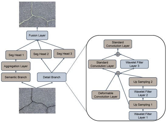 In this paper, we propose a simple yet efficient module, namely, the instance normalization wavelet (INW) layer, for crack detection. Differing from the Fourier transform the wavelet transform, as a spatial–frequency analysis tool, it captures the thin mutations effectively. The wavelet transform calculates the inner products between the employed wavelet functions and the signals. As shown in Figure 1, by 2D wavelet transform for the crack images, the low-frequency component retains the vast majority of details for the cracks and suppresses the background noises significantly. From a signal-processing perspective, convolution layers can be viewed as data-driven adaptive wavelet filters which extract features in the horizontal and vertical directions. Inspired by this idea, we embed the wavelet transform with a priori knowledge into the deep learning-based detection model, aiming to strengthen the representation learning ability for these subtle cracks. Compared with the standard wavelet transform, the corresponding weights are learned in an end-to-end way. Additionally, we add instance normalization after the wavelet transform to alleviate the differences in the features of the cracks. These strategies enable the adaptability and generalization of our method. Our architecture is largely based on BiSeNet V2 [10], which is a representative image semantic segmentation architecture. The architecture consists of two complementary branches, the detail branch and the semantic branch. The first branch is used to extract detailed information, and the second branch is employed to extract global information. To boost the ability of local feature extraction, we primarily made modifications in the detail branch. We incorporate two serial INW layers at the low level and one INW layer at the middle level, respectively. Deformable convolution is employed to expand the receptive fields in the first layer. In addition, we leverage a convolution layer to fuse the local and global predictions of these two branches. Extensive experiments on DeepCrack and CRACK500 datasets demonstrate that our method outperforms the recent crack detection methods.