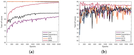 F-score curves on the DeepCrack dataset: (a) training dataset; (b) test dataset.