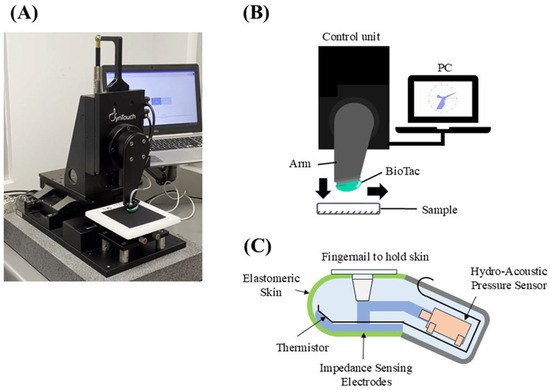 Overview of the Toccare system and biomimetic multimodal tactile sensor. (A) Experimental apparatus, (B) measuring mechanism, and (C) schematic of the BioTac finger-shaped tactile sensor.