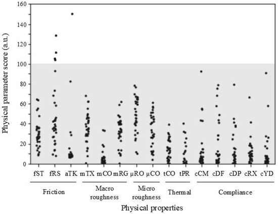 The physical parameters of the materials were evaluated using the Toccare system [22], which incorporates the BioTac biomimetic multimodal tactile sensor [21]. Figure 1 shows an overview of the system and device. The device was equipped with internal sensors, including a pressure sensor, electrodes, and a thermistor. The finger-shaped device is covered with an elastomer-based artificial skin filled with incompressible conductive fluid. Force is estimated based on voltage changes caused by the deformation of the artificial skin and the internal fluid when in contact with a material [27]. Micro-vibrations generated by contact with the material propagate through the internal fluid and reach a hydro-acoustic pressure sensor embedded in the sensor. The fingerprint pattern engraved on the surface of the artificial skin amplifies the vibration amplitude, enabling the detection of micro-vibrations [28]. The internal fluid is heated to human body temperature by a heater embedded in the electronic circuit. This ensures that, upon contact with a material, the sensor generates thermal conduction similar to human touch, allowing the estimation of the material’s thermal properties. From these measurement data, the original physical parameters listed in Table 3 were predicted using Bayesian exploration, resulting in 15 items similar to human tactile perception [24]. The 15 physical parameters were categorized as follows: friction (fST, fRS, and aTK), macro-roughness (mTX, mCO, and mRG), micro-roughness (μRO and μCO), thermal properties (tCO and tPR), and compliance (cCM, cDF, cDP, cRX, and cYD). Although the default lower and upper limits for each parameter were 0 and 100, respectively, scores of ≥100 were calculated in some cases [23,29]. Several defined movements—short- or long-distance sliding and pushing of the flat surface with the device—were performed in the evaluation of the physical parameters. The mean was selected as the physical parameter for each material when measurements were conducted five times.