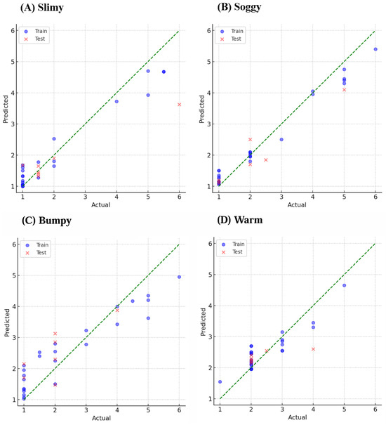 Prediction model for the representative sensory descriptors: (A) slimy, (B) soggy, (C) bumpy, and (D) warm. Blue circles indicate training data, and red crosses indicate test data.