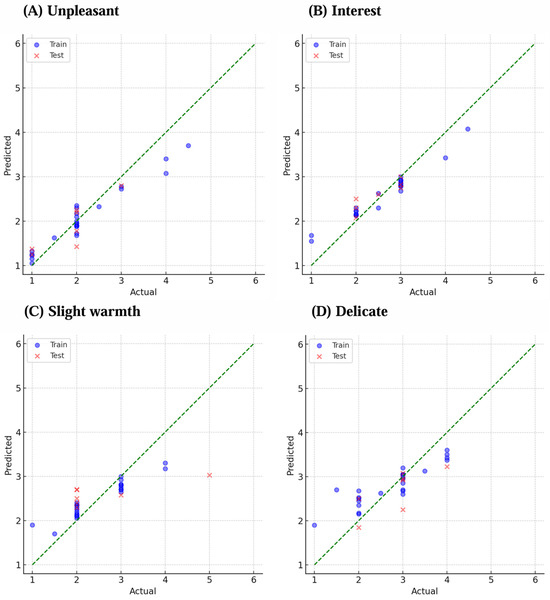 Prediction model for the representative affective descriptors: (A) unpleasant, (B) interest, (C) slight warmth, and (D) delicate. Blue circles indicate training data, and red crosses indicate test data.