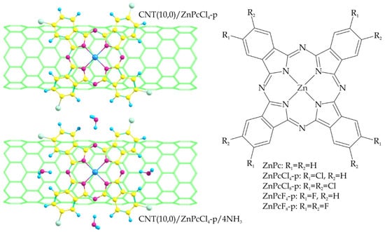 Examples of a geometric structure of optimized compounds under consideration—CNT(10,0)/ZnPcCl4-p (top left) and CNT(10,0)/ZnPcCl4-p/NH3 (bottom left). Structural formula of zinc phthalocyanine derivatives considered in the work (right).