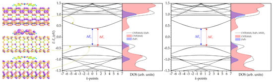 Geometry optimization of the CNT(10,0)/MC/4NH3 compounds was also performed to relax the position of all atoms at a fixed value of the CNT(10,0) supercell length. Then, the band structure of these compounds was analyzed, and using the obtained values of the total energy of the corresponding hybrid with four ammonia molecules, without NH3 molecules and only ammonia molecule, the average value of the binding energy Eb(NH3) of the NH3 molecule was calculated using Equation (2).