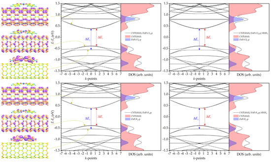 Electronic wave functions of the conduction band bottom, impurity band, and valence band top of CNT(10,0)/ZnPcCl4-p and CNT(10,0)/ZnPcF4-p hybrids (left panels); band structure and DOS of hybrids without NH3 molecules (center panels) and with NH3 molecules (right panels).