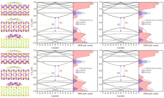 Electronic wave functions of the conduction band bottom, impurity band, and valence band top of the CNT(10,0)/ZnPc hybrid (left panel); band structure and DOS of the hybrid without NH3 molecules (center panel) and with NH3 molecules (right panel).