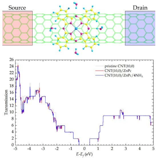 Schematic diagram of the device for calculating the conductivity of hybrids (top) and the dependence of the electron transmission coefficient on their energy in the case of the pristine CNT(10,0), CNT(10,0)/ZnPc, and CNT(10,0)/ZnPc/4NH3 (bottom).