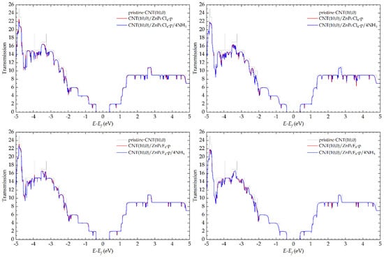 The addition of zinc phthalocyanines onto the CNT(10,0) surface was accompanied by the appearance of sharp dips in the transmission functions of the pristine carbon nanotube at certain electron energies (Figure 5 and Figure 6). These Fano effects were previously described by Prasongkit et al. []. They are associated with the interference of discrete states of macrocycles and continuous bulk states of CNT. Further addition of NH3 molecules led mainly to a slight shift of these dips to the left. In a few cases, significant strengthening or weakening of the peaks or even an appearance of new ones was observed (e.g., at −2.6 eV, −3.1 eV, and −3.3 eV in the case of CNT(10,0)/ZnPc or at 3.6 eV in the case of CNT(10,0)/ZnPcCl8-p). All these changes are associated with the shift of the electron density from the analyte molecule to the hybrid and should lead to a change in the integral conductivity.
