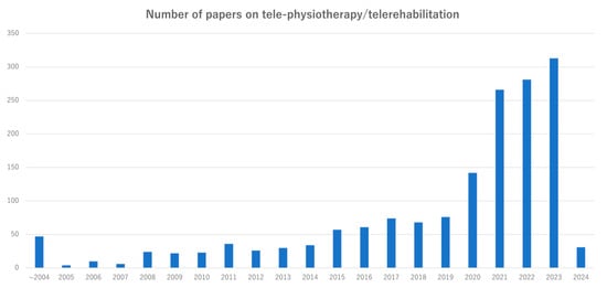 Telemedicine is an important interface for providing medical care to patients with various diseases. Tele-rehabilitation, which has been employed in clinical settings overseas since the early 21st century, is now emerging as a significant area of research. A database search for articles with “tele-rehabilitation” or “tele-physiotherapy” in the title revealed there were 2205 articles in the last five years alone, indicating a rapid surge in recent clinical studies (Figure 1). This rapid growth in the number of such clinical studies reflects the increasing expectation and interest in tele-physiotherapy, a field expected to continue evolving.