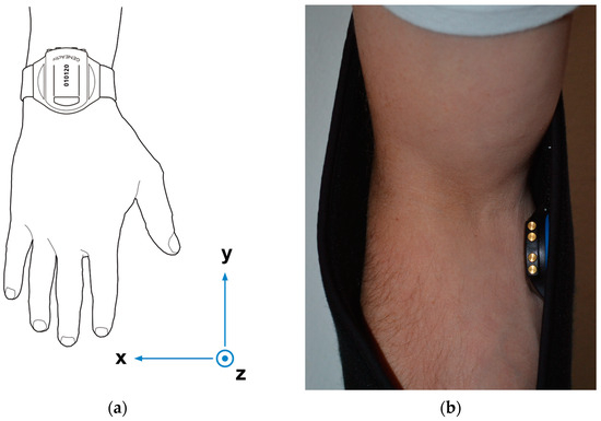 (a) Position of the GENEActiv fitted to the inner side of the sling next to the participant’s arm; (b) orientation of axes.