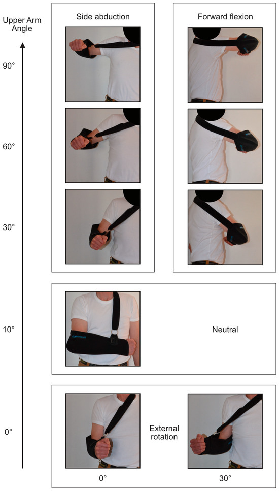 Pre-specified arm postures during sling wear. Upper arm angles: neutral (10°), forward flexion (30°, 60°, 90°), side abduction (30°, 60°, 90°); external rotation angles (0°, 30°).