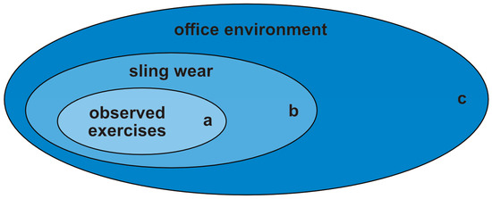 The three nested datasets generated for each participant: (a) sling wear during pre-specified arm postures during sling wear with recorded upper arm angle; (b) sling wear in free-living ‘office environment’; (c) sling wear and non-wear in free-living ‘office environment’.