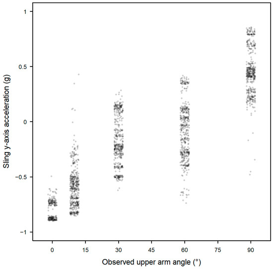 The acceleration measured in the y axis of the sling sensor was significantly associated with upper arm angle in the specified sling postures, R2 = 0.75 (p < 0.001, Model 1, Figure 4). The addition of the x and z axes of acceleration increased the R2 to 0.83 (p < 0.001, Model 2).