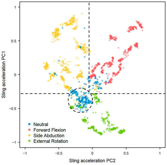 The clustering of components 1 and 2 revealed distinct patterning by type of movement (neutral, forward flexion, side abduction, and external rotation) (Model 4, Figure 5). Both PC1 and PC2 were retained for analyses of arm posture during sling wear, with increasing PC1 indicating increasing upper arm elevation. The Dunn Index is the ratio of the minimum distance between clusters and the maximum distance within clusters with higher scores representing better clustering; for Model 4, we found a value of 0.619.
