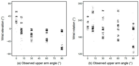 Association of upper arm angle with wrist elevation (a) and wrist rotation (b) (Model 5a).