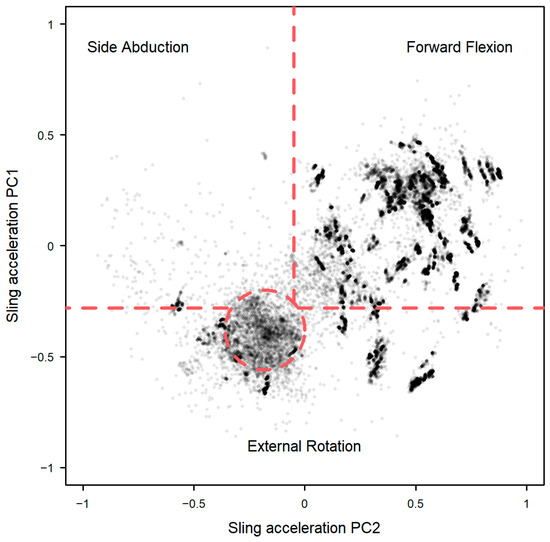 Clustering PC1 and PC2 from the sling sensor data revealed distinct patterning during sling wear while in a free-living office environment (Model 7, Figure 7). Applying the sling posture classification schema from Model 4 suggests the majority of the time was spent in the forward flexion (67.1%) and external rotation postures (18.5%) (Table 2).