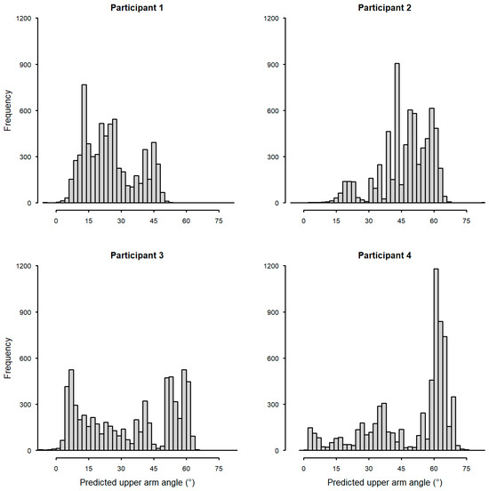 Frequency of upper arm angle predicted from sling sensor by participant.