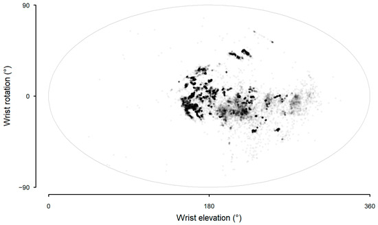 Aitoff projection of wrist elevation and wrist rotation from the wrist sensor data during sling wear in a free-living office environment.