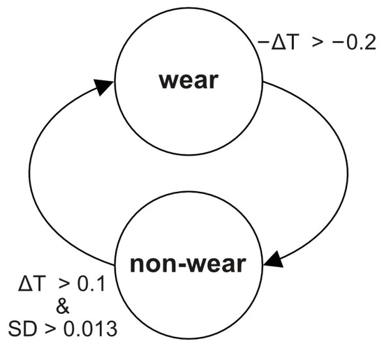 The algorithm developed to detect sling non-wear by Baraket et al. [2] was adapted for implementation in R as a state machine (Figure 10). An increase or decrease in temperature accompanied by a change from low to high acceleration standard deviation (or vice versa) triggers the change of wear state. Following initial testing, the original algorithm was modified to remove the requirement for lack of movement to mark the beginning of a wear period. This was to avoid movement in removing the sling leading to misclassification.