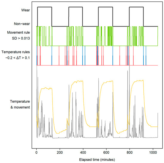 An illustration of the optimised algorithm in action is shown in Figure 11. Green shows the movement rule (mean standard deviation > 0.013 g (13 mg)), blue shows the temperature dropping (<−0.2°), suggesting the start of a non-wear period, while red shows the temperature increasing (>0.1°), suggesting the end of non-wearing and the start of wear. The rules combined give the dark trace at the top of the plot, indicating wear and non-wear.