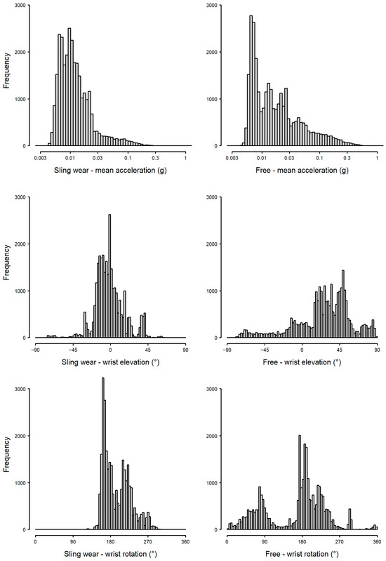 Mean wrist acceleration (top), wrist elevation (middle), and rotation (bottom) during sling wear (left) and free movement (right).