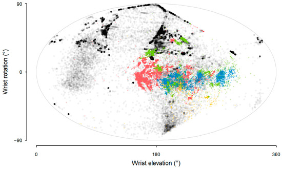 Aitoff projection of wrist elevation and wrist rotation from the wrist sensor data during sling non-wear (black with transparency) and sling wear categorised by predicted arm posture during sling wear: neutral (blue), forward flexion (red), side abduction (yellow), and external rotation (green).