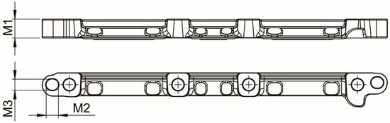 Measurements of machined parts are performed with an automatic control station, which uses Keyence GT2 series high-accuracy digital contact displacement sensors (probes). The digital signals were acquired through KEYENCE (Belgium, Mechelen) NR-600 DAQ, and collected data is automatically saved and transferred to a server using the FTP client function. After milling all 4 parts, the Hyundai robot HH020L positions each machined part (Part 1, Part 2, Part 3, and Part 4) on the control station for M1, M2, and M3 measurements shown in Figure 4. Table 3 offers additional information on the sensors used and part measurements (M1, M2, and M3) relations.