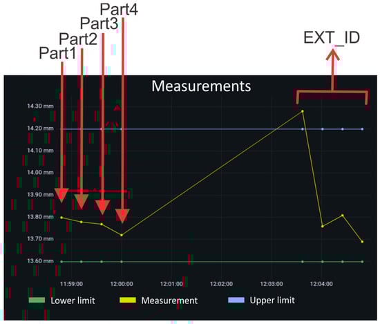 Part accuracy measurements are gathered from the automatic control station (after the robot picks the machined parts one after another, starting with Part 1 and ending with Part 4) and saved to the InfluxDB database. Part accuracy measurements, presented in Table 5, are recorded for 6 different parameters wherein each machined part (Part 1, Part 2, Part 3, and Part 4) gets assigned a unique combination of 3 process parameters (TIME, EXT_ID, and MEASUREMENT_ID) and 3 machined part measurements (M1, M2, and M3). Figure 5 shows M1 measurements in real-time with the Grafana visualization tool.