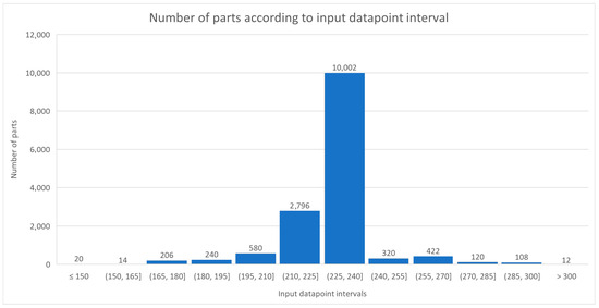 The total number of machined parts for which data was collected from the machine controller amounted to 14,840. Upon reviewing the data for the processed parts, it was found that they do not have the same number of datapoints, which is crucial for further processing with machine learning algorithms. Significant discrepancies in the number of captured datapoints between individual processed parts were observed, as illustrated in the histogram (Figure 6). Most processed parts (10,002) had a datapoint count in the range of 225 to 240 datapoints.