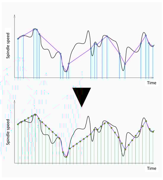 Preprocessing of controller data time series. The linear interpolation between the acquired datapoints was executed first and is depicted on the top, followed by resampling of the data with an evaluation of exactly 231 chronologically equidistant points. This operation ensures the same number of datapoints in each sample.