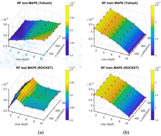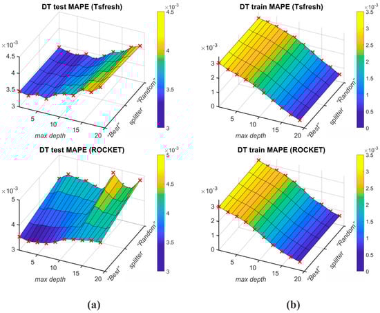 Table 10 displays -fold cross-validation results of ML algorithms (RF, k-NN, and DT) for the Tsfresh and ROCKET feature extraction protocols. The best mean test MAPE results for M3 output were achieved with the use of the DT algorithm, wherein the Tsfresh-based feature extraction resulted in 0.003325, and ROCKET achieved a 0.003443 mean test MAPE. Figure 10 depicts the DT algorithm MAPE results for different grid searched parameters. The worst mean test MAPE was achieved by the k-NN algorithm for both Tsfresh and ROCKET feature extraction protocols (respectively, 0.003571 and 0.003457). The best mean train MAPE was achieved with the RF algorithm, wherein Tsfresh and ROCKET feature extraction resulted in 0.002753 and 0.002629.