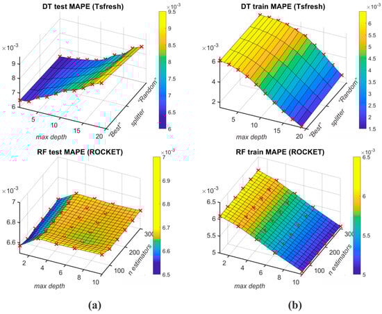 Test MAPE (a) and train MAPE (b) of DT’s and RF’s grid searched parameters for splitter, n_estimators, and max_depth.