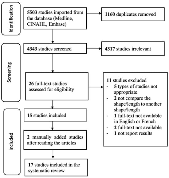 Following the literature search in databases, 5503 articles were identified after 1160 duplicates were removed. The titles and abstracts screening led to the exclusion of 4317 records, and 26 articles were retained for full text assessment, where 11 other articles were excluded. Indeed, one article was written in Spanish [], two were not available in full text [,], one did not report relevant results to the purpose of this systematic review [], and seven articles did not compare the shape or the length of the 6MWT pathway [,,,,,,]. Finally, 15 articles were selected, and two other articles that were identified from reference checking and determined as relevant were manually added to this review, for a total of 17 included articles (see Figure 1).