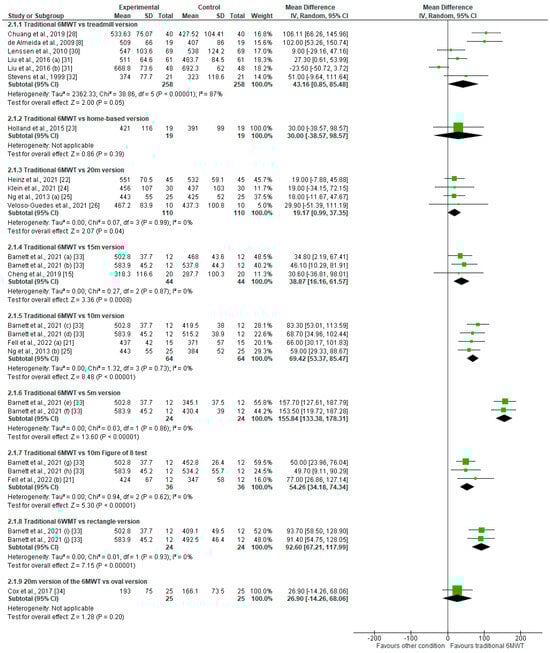 Forest plot representing the distance covered by participants in the different conditions and versions of the 6MWT [,,,,,,,,,,,,,].
