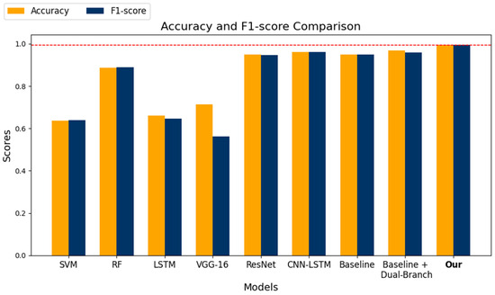 Figure 5 shows a comparison of the experimental results in terms of Accuracy and F1-score, highlighting the improvements of our model over the baseline and comparison models. The results demonstrate that our model outperforms the baseline model as well as other comparison models, exhibiting superior performance.